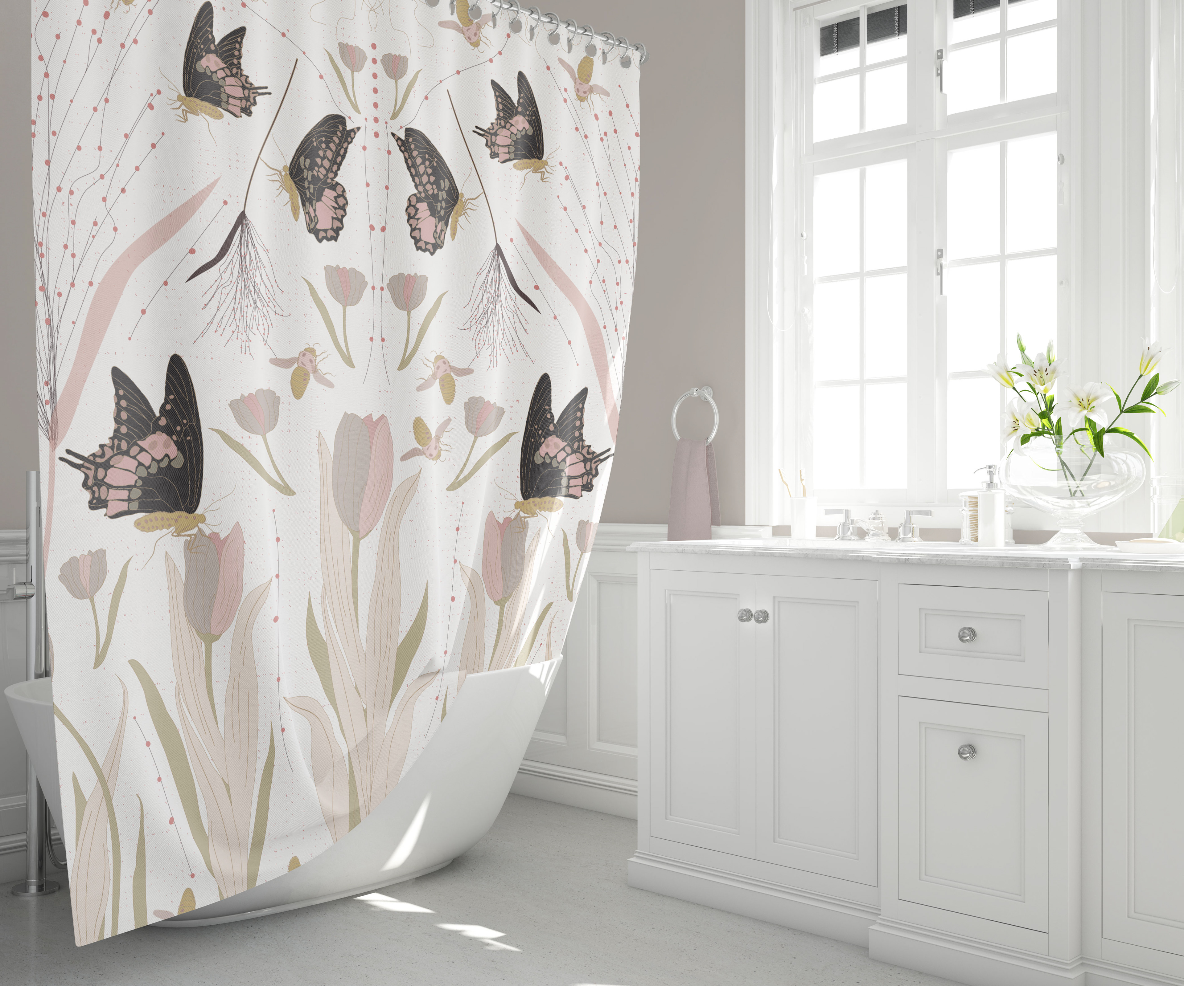 Designer Shower Curtains Floral patterned shower curtains. Unique and original floral patterns from surface pattern designers Jenn & Allison Steffen. If you are looking to update your tub and shower, these shower curtains are a simple and elegant way to do it! These are 100% polyester with a vivid, full-color print. The curtain dimensions are 71" x 71". Liners and shower hooks are sold separately and not included. Contact us at Studio Posies if you need assistance or have questions about patterns or products.